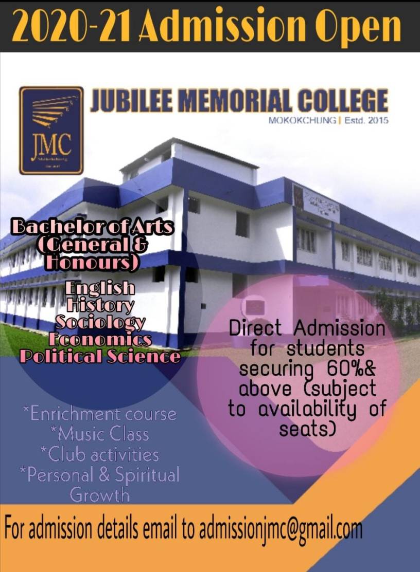 Jubilee Memorial College, at present, is being run at the Mission Compound, Aongza; Mokokchung. This college is expected to be one of the best in the state. Besides, the usual Nagaland University syllabus, the college also focuses on ‘enrichment courses’ ‘music’ and ‘spiritual counseling’ so that the students of the college would become astute, responsible and spiritually strong citizens and future leaders of the society.