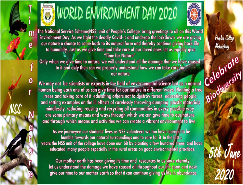 The unprecedented situation arising out of the Covid-19 pandemic has created an opportunity for our mother earth to reinvigorate, to continue giving life to all of us. On this day and situation the National Service Scheme (NSS) volunteers of People’s College, Mokokchung, also took the initiative to do its bit and organized a function with a limited number of NSS volunteers at the college campus following all the SOPs of the covid-19 pandemic.