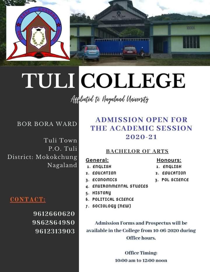 Advertisements Tuli College: Admission Open for 2020-2021 Date: June 5, 2020Author: nokinketer 0 Comments 9612660620 Tuli TownP.O TuliMokokchung, Nagaland India Share this: Share on X (Opens in new window) X Share on Facebook (Opens in new window) Facebook Like Loading...