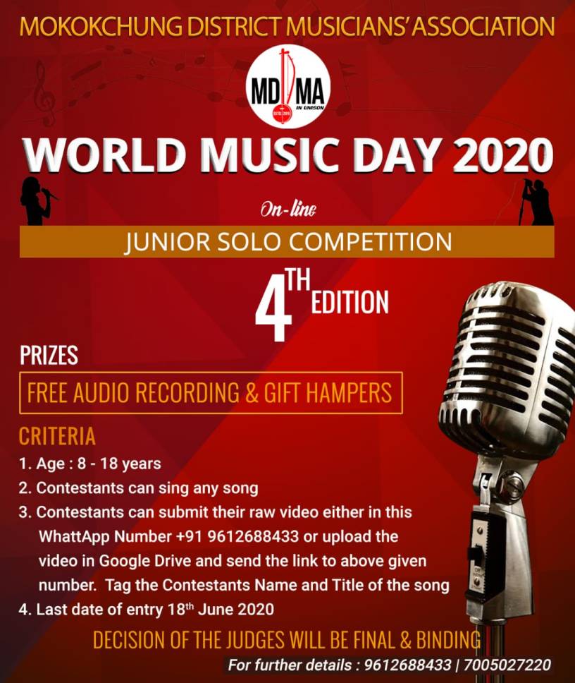 The MDMA, Mokokchung District Musicians Association is delighted to bring to you the 4th edition of the MDMA Junior Solo Competition, 2020 on the occasion of World Music Day June 21st 2020.