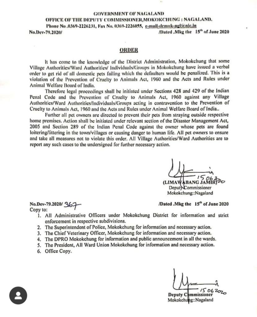 The Deputy Commissioner of Mokokchung had earlier issued an order on 15th of June under the Prevention of Cruelty to Animals Act, 1960 stating that legal proceedings will be initiated against those issuing shoot at sight order for dogs.
