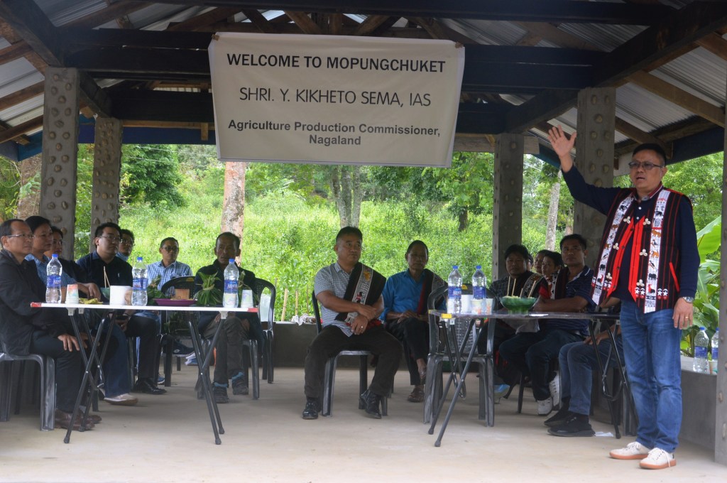 A team headed by Agriculture Production Commissioner of Nagaland, Y. Kikheto Sema IAS is on a statewide tour to inspect and monitor the various ongoing projects under NEC. The team toured Zunheboto district on September 14 & 15 and toured Mokokchung district on September 16. The team will leave for Longleng district on September 17 and return to Kohima on September 19 next. Seen here is the Agriculture Production Commissioner addressing Mopungchuket villagers, Mokokchung district, September 16.
