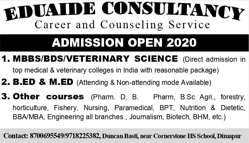 Advertisements EDUAIDE CONSULTANCY Date: October 17, 2020Author: Sashimeren Jamir 0 Comments Career & counseling service ADMISSION OPEN 2020 Share this: Click to share on X (Opens in new window) X Click to share on Facebook (Opens in new window) Facebook Like Loading...