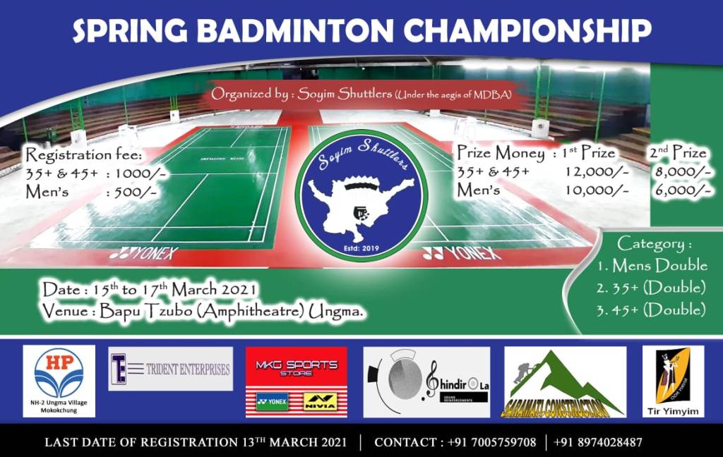 Breaking News SPRING BADMINTON CHAMPIONSHIP 2021 Date: March 5, 2021Author: Sashimeren Jamir 0 Comments Organized by: Soyim Shuttlers (Under the aegis of MDBA) Share this: Click to share on X (Opens in new window) X Click to share on Facebook (Opens in new window) Facebook Like Loading...