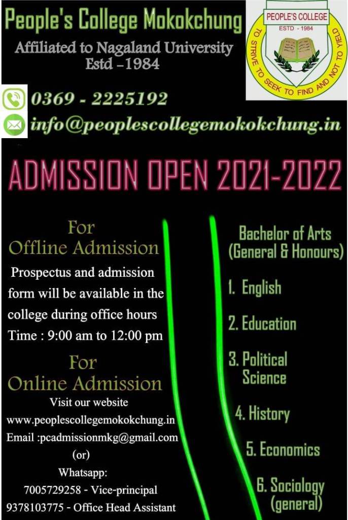 Advertisements People’s College Mokokchung Date: July 19, 2021Author: Sashimeren Jamir 0 Comments Admission Open (2021-2022) Share this: Click to share on X (Opens in new window) X Click to share on Facebook (Opens in new window) Facebook Like Loading...