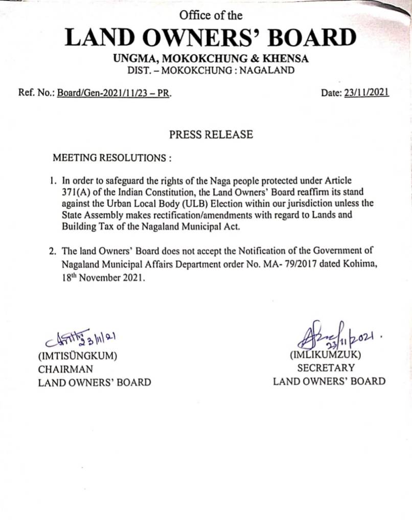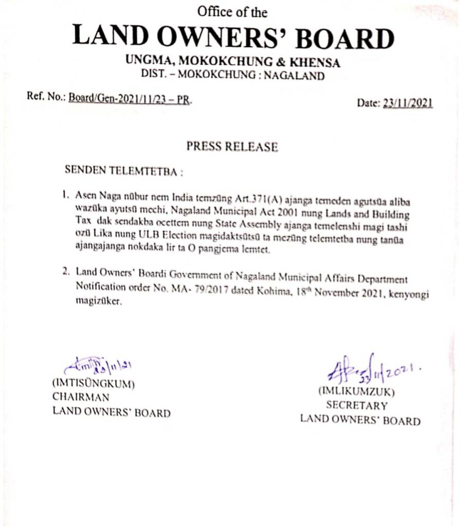 Naga nübur nem India temzüng Arla 371(A) ajanga temeten agüja aliba wazüka ayutsü mechi, Nagaland Municipal Act 2001 nung ali aser ki saru (Lands and Building Tax) dak sentakba ocettem nung State Assembly ajanga temelenshi magi tashi ozü Lika nung ULB election magidaktsütsü ta mezüng telemtetba nung tanüa ajang-ajanga noktaka lir, ta yim asem sangeri tentetba Land Owners’ Board Ungma, Mokokchung & Khensa Chairman, Imtisüngküm aser Secretary Imlikümzük nati yokba sangdong ka ajanga metetdaktsüogo.