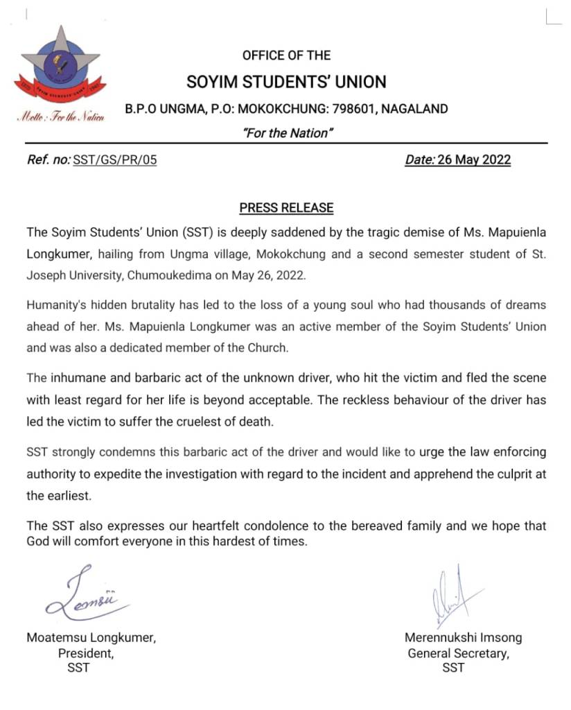 The Soyim Students’ Union (SST) is deeply saddened by the tragic demise of Ms. Mapuienla Longkumer, hailing from Ungma village, Mokokchung and a second semester student of St. Joseph University, Chumoukedima on May 26, 2022.