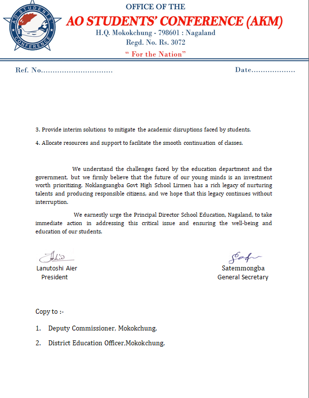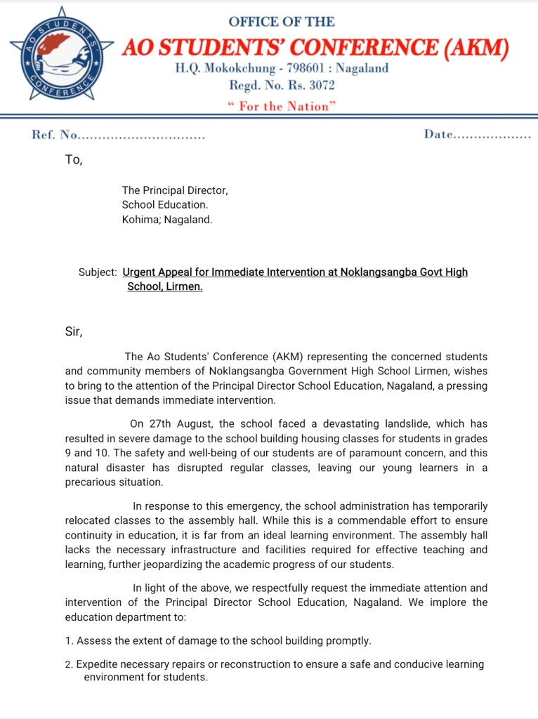 Ao Kaketshir Mungdang (Ao Students' Conference) Urgent appeal for immediate intervention at Noklangsangba Govt. High School, Lirmen, Mokokchung district Date: September 4, 2023Author: nokinketer 0 Comments PAGE 1/2 PAGE 2/2 Share this: Click to share on X (Opens in new window) X Click to share on Facebook (Opens in new window) Facebook Like Loading...