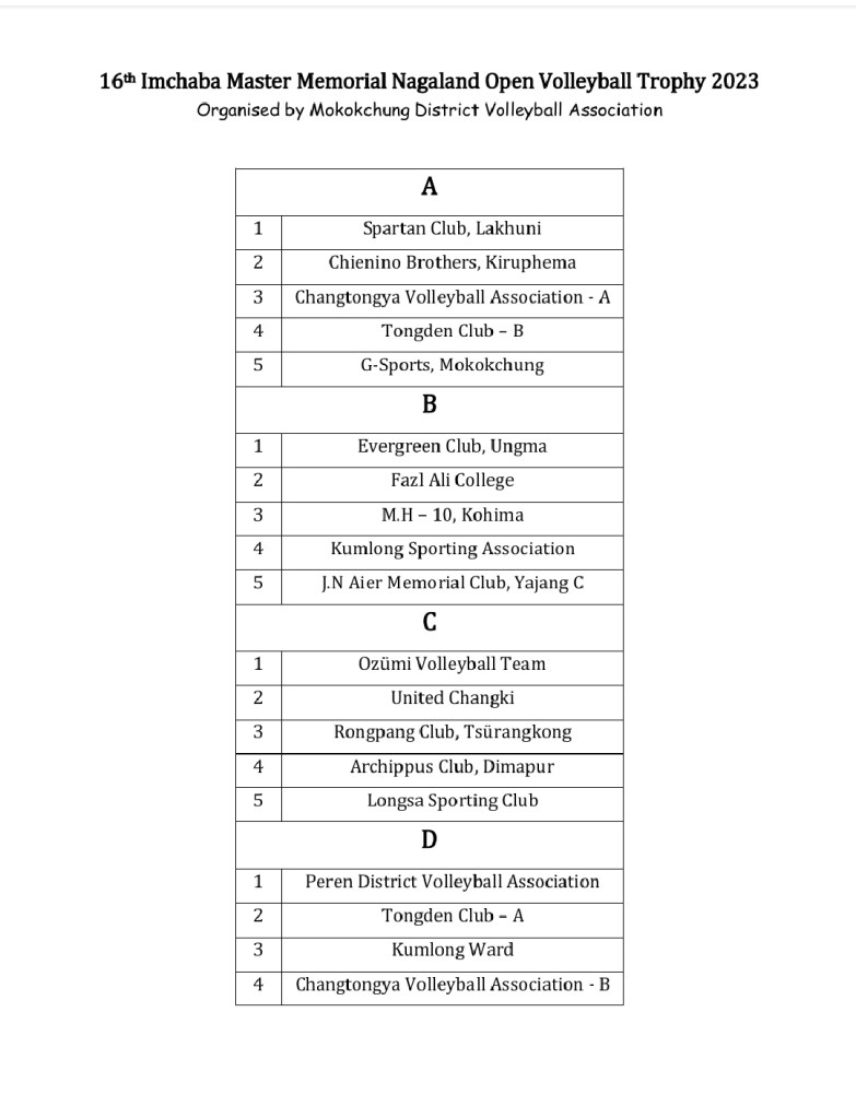 Chienino Brothers, Kiruphema, Archippus Club, Dimapur, United Changki, G-Sports, Mokokchung, Ozümi Volleyball Team, Mongsenbai, and Rongpang Club, Tsürangkong, will be the new entrants to the tournament. The inaugural function will be held on September 19 from 10:00 a.m. onwards with Col. Rahul Gurung, Kirti Chakra, Commandant, 12 Assam Rifles, Mokokchung, as the inaugural patron.