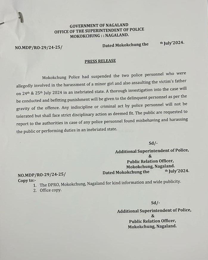 Breaking News Mokokchung Police put two police personnel on suspension Date: July 29, 2024Author: nokinketer 0 Comments Share this: Click to share on X (Opens in new window) X Click to share on Facebook (Opens in new window) Facebook Like Loading...