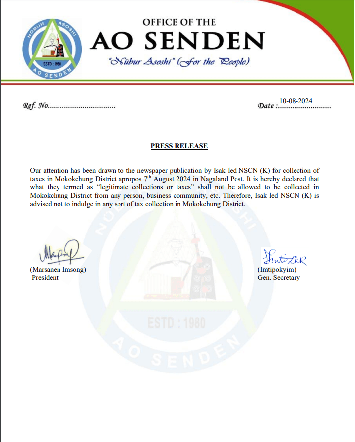 Ao Senden (Ao Hoho) Isak led NSCN (K) is advised not to indulge in any sort of tax collection in Mokokchung District Date: August 10, 2024Author: nokinketer 0 Comments Press Release issued by Ao Senden Share this: Click to share on X (Opens in new window) X Click to share on Facebook (Opens in new window) Facebook Like Loading...