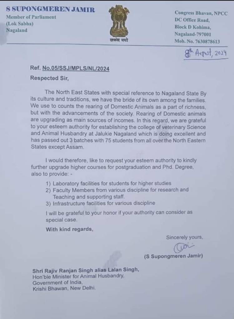 Lok Sabha MP from Nagaland S. Supongmeren Jamir, has requested the centre to upgrade the College of Veterinary Science and Animal Husbandry in Jalukie. In a letter to Union Minister of Fisheries, Animal Husbandry and Dairying, Rajiv Ranjan Singh, Jamir has sought the introduction of postgraduate and PhD level courses at the college.
