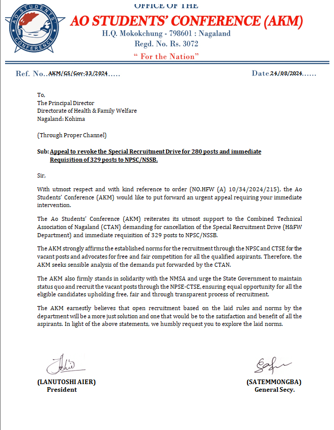 Ao Kaketshir Mungdang (Ao Students' Conference) AKM Appeal to revoke the Special Recruitment Drive for 280 posts and immediate requisition of 329 posts to NPSC/NSSB Date: August 26, 2024Author: nokinketer 0 Comments Share this: Click to share on X (Opens in new window) X Click to share on Facebook (Opens in new window) Facebook Like Loading...