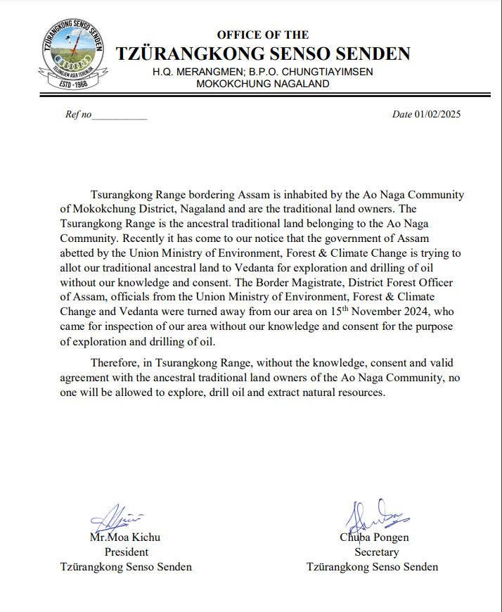 Tsurangkong Range bordering Assam is inhabited by the Ao Naga Community of Mokokchung District, Nagaland and are the traditional land owners. The Tsurangkong Range is the ancestral traditional land belonging to the Ao Naga Community. Recently it has come to our notice that the government of Assam abetted by the Union Ministry of Environment, Forest & Climate Change is trying to allot our traditional ancestral land to Vedanta for exploration and drilling of oil without our knowledge and consent. The Border Magistrate, District Forest Officer of Assam, officials from the Union Ministry of Environment, Forest & Climate Change and Vedanta were turned away from our area on 15th November 2024, who came for inspection of our area without our knowledge and consent for the purpose of exploration and drilling of oil.