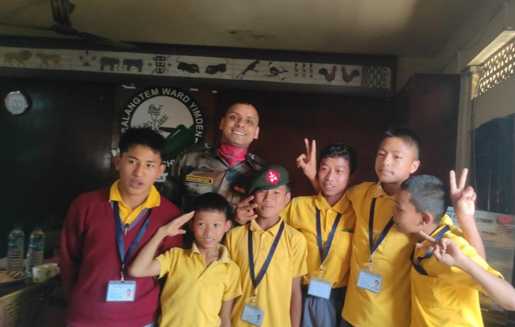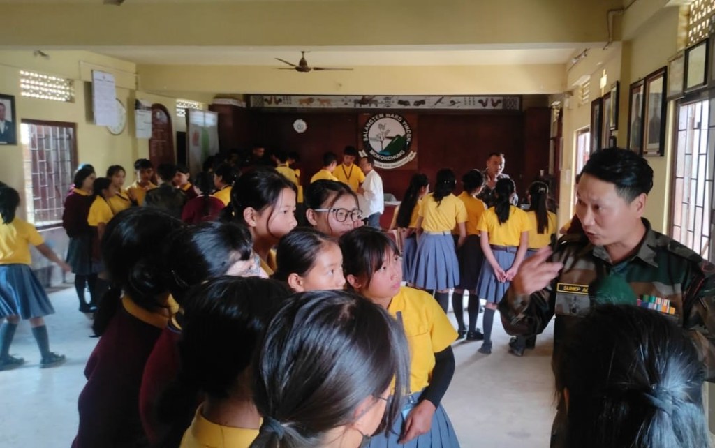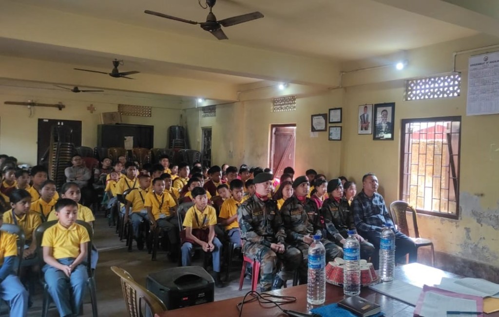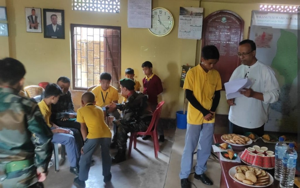 Rfn / GD Roshan Poudel, Rfn / GD Mejatemjen, Rfn / GD Meyisunep, Hav / Clerk Nungsangrenla Jamir from the 12th Battalion, The Assam Rifles, posted at Mokokchung, along with Lieutenant Colonel Joy Choudhury, from the Zila Sainik Board, Mokokchung, in the true spirit of the ‘Friends Of The Hill’s People’, ‘Sentinels of The East’, on the 26th April 2025, interacted with the students of GMS Salangtem, Mokokchung on the theme, ‘Living Life – The Armed Forces Way’.