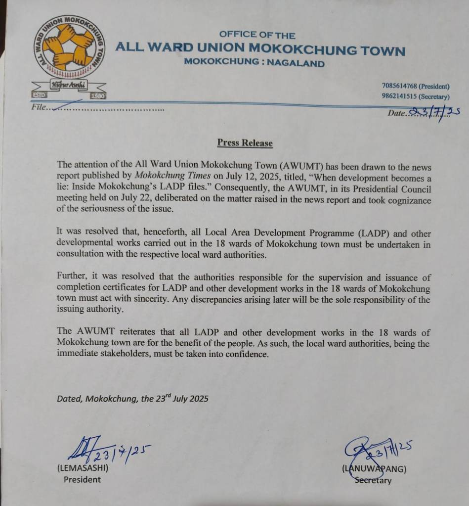The attention of the All Ward Union Mokokchung Town (AWUMT) has been drawn to the news report published by Mokokchung Times on July 12, 2025, titled, “When development becomes a lie: Inside Mokokchung’s LADP files.” Consequently, the AWUMT, in its Presidential Council meeting held on July 22, deliberated on the matter raised in the news report and took cognizance of the seriousness of the issue.
