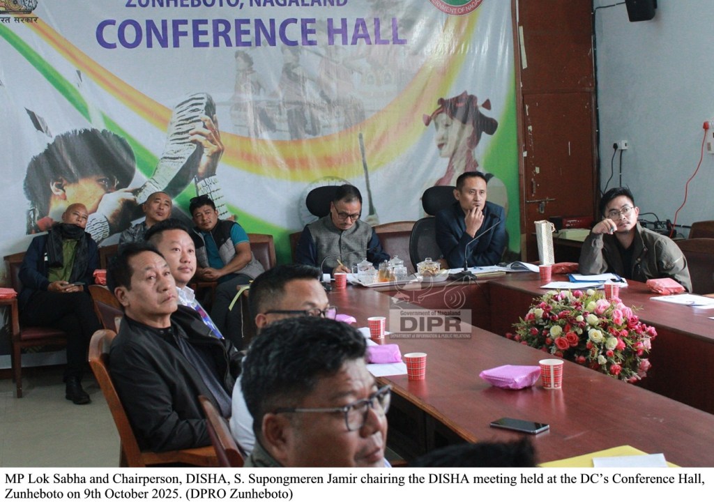 Mokokchung, 09 October (www.nokinketer.in): The District Development Co-ordination and Monitoring Committee (DISHA) meeting for Zunheboto district was held under the chairmanship of Member of Parliament Lok Sabha and Chairperson, DISHA, S. Supongmeren Jamir at the Deputy Commissioner’s conference hall, Zunheboto, on 9th October 2025.