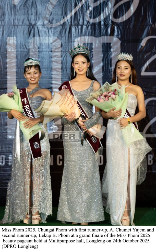 Amidst an enchanting evening filled with elegance, poise, and celebration of womanhood, 23 years old Chungai Phom (Contestant No. 11) emerged victorious, outshining a field of talented contestants to win the coveted Miss Phom 2025 Title. 24 years old A. Chumei Yajem was adjudged First Runner-Up, while 21 years old Lekup B. Phom secured the Second Runner-up position.