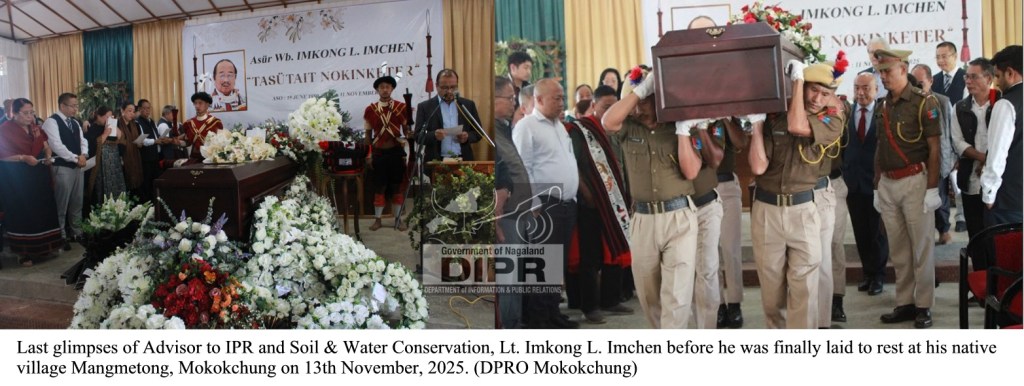 Mokokchung, 15th November, 2025 (www.nokinketer.in): In Mokokchung Town, the Ao Senden organised a solemn condolence programme on 12th November 2025 at the main Police Point to pay the last homage to the late Imkong L. Imchen, Advisor for Information and Public Relations and Soil and Water Conservation, who passed away on November 11, 2025.