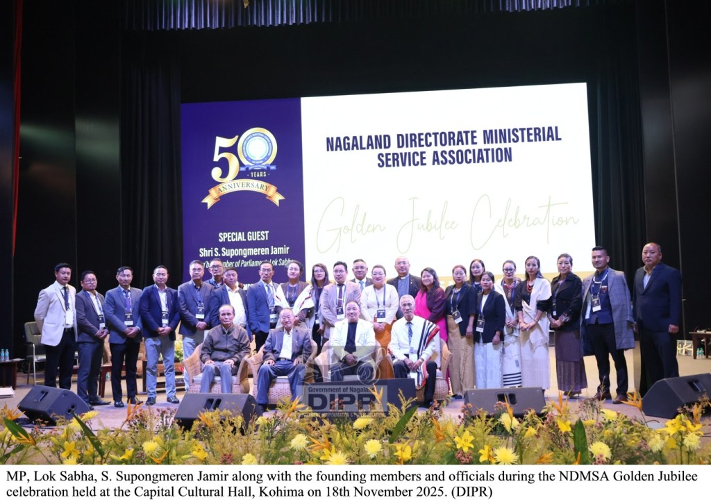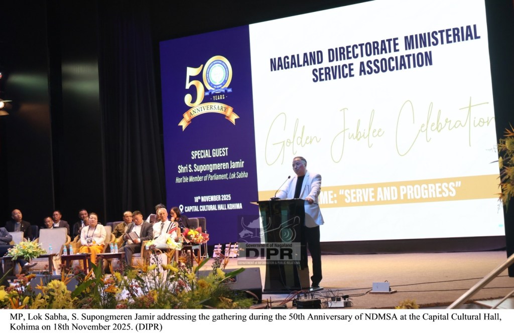 Mokokchung, 19-Nov-2025 (www.nokinketer.in): The Nagaland Directorate Ministerial Service Association (NDMSA) celebrated its 50th Anniversary at the Capital Cultural Hall, Kohima, under the theme “Serve and Progress” on 18th November 2025 with S. Supongmeren Jamir, Member of Parliament, Lok Sabha, as the Special Guest.