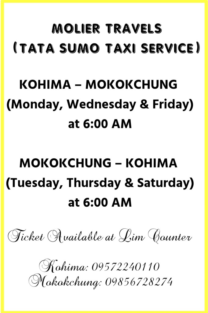 Tetsur Ola New Tata Sumo Taxi Service from Kohima to Mokokchung & Mokokchung to Kohima on alternate days Date: March 5, 2026Author: nokinketer 0 Comments Oplus_16908288 Share this: Share on X (Opens in new window) X Share on Facebook (Opens in new window) Facebook Like Loading...