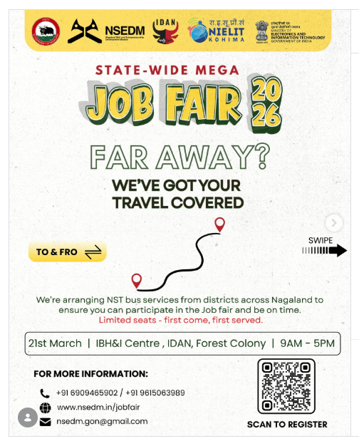 Mokokchung, 19th March, 2026 (www.nokinketer.in): The Nagaland Skill & Entrepreneurship Development Mission (NSEDM), Investment Development Authority of Nagaland (IDAN), in collaboration with NIELIT, Kohima, Government of India, will be organizing a State-Wide Mega Job Fair on 21st March 2026 at the Integrated Business Hub and Innovation Centre (IBH&IC), Forest Colony, Dimapur, with the inaugural programme at 9.30 AM. The event will be graced by the Chief Secretary of Nagaland, Sentiyanger Imchen, IAS, as honoured guest.